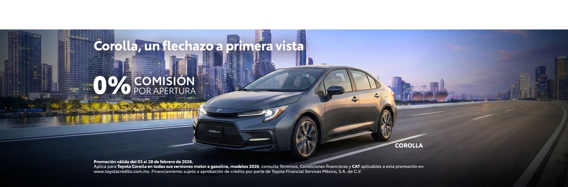 Aplica para Toyota Corolla en todas sus versiones motor a gasolina, modelos 2026; bajo las siguientes condiciones de contratación: tasa de interés desde 11.99%; comisión por apertura del 0%; plazos de financiamiento desde 12 y hasta 72 meses; con un enganche desde 10% tomando en cuenta el valor del vehículo en la fecha de publicación de este aviso; esta promoción aplica para todos los esquemas de financiamiento. Asimismo, el producto financiero a que se refiere este aviso requiere la contratación obligatoria de dos seguros, el primero contra daños y otro, una póliza de SEGURO DE VIDA CRÉDITO CON PERIODO DE CARENCIA Y MUERTE ACCIDENTAL, las pólizas pueden ser pagadas ya sea en un esquema financiado o cubierto en una sola exhibición al momento de la firma del contrato. Cualquier modificación a los elementos antes referidos, cambiará invariablemente las condiciones del financiamiento, por tal razón le sugerimos consultar términos y condiciones con el Distribuidor Toyota de su preferencia;