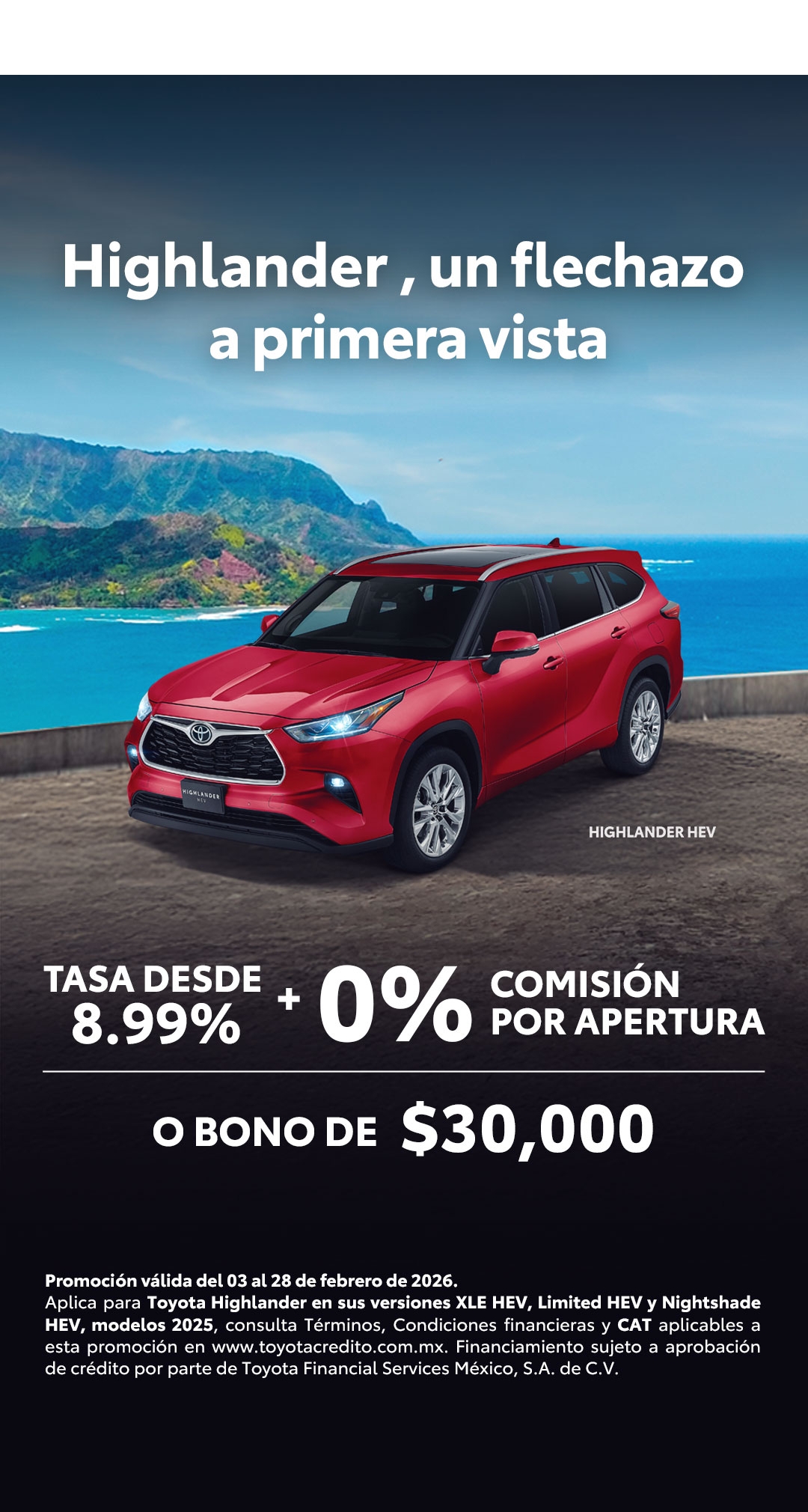 Aplica para Toyota Highlander en sus versiones XLE HEV, Limited HEV y Nightshade HEV, modelos 2025; bajo las siguientes condiciones de contratación: tasa de interés desde 10.99%; comisión por apertura del 0%; plazos de financiamiento desde 12 y hasta 72 meses; con un enganche desde 10% tomando en cuenta el valor del vehículo en la fecha de publicación de este aviso; esta promoción aplica para todos los esquemas de financiamiento. Este plan incluye un BONO por la cantidad de $30,000 M.N.  (treinta mil pesos 00/100 M.N.) el cual se aplicará EXCLUSIVAMENTE al costo de adquisición del vehículo. Asimismo, el producto financiero a que se refiere este aviso requiere la contratación obligatoria de dos seguros, el primero contra daños y otro, una póliza de SEGURO DE VIDA CRÉDITO CON PERIODO DE CARENCIA Y MUERTE ACCIDENTAL, las pólizas pueden ser pagadas ya sea en un esquema financiado o cubierto en una sola exhibición al momento de la firma del contrato. Cualquier modificación a los elementos antes referidos, cambiará invariablemente las condiciones del financiamiento, por tal razón le sugerimos consultar términos y condiciones con el Distribuidor Toyota de su preferencia;