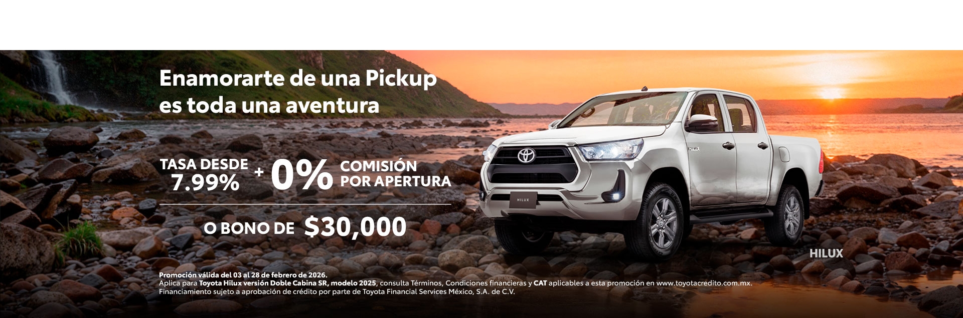 Aplica para Toyota Hilux versión Doble Cabina SR, modelo 2025; bajo las siguientes condiciones de contratación: tasa de interés desde 7.99%; comisión por apertura del 0%; plazos de financiamiento únicamente de 36 meses; esta promoción aplica exclusivamente al esquema de financiamiento denominado Plan Tradicional. Asimismo, el producto financiero a que se refiere este aviso requiere la contratación obligatoria de dos seguros, uno contra daños y otro, una póliza de SEGURO DE VIDA CRÉDITO CON PERIODO DE CARENCIA Y MUERTE ACCIDENTAL, las pólizas pueden ser pagadas ya sea en un esquema financiado o cubierto en una sola exhibición al momento de la firma del contrato. Con un monto máximo a financiar por la cantidad de $488,000 M.N. (cuatrocientos ochenta y ocho mil pesos 00/100 Moneda Nacional), el monto a financiar puede variar en caso de que las pólizas de seguro sean contratadas en un esquema de financiamiento. Cualquier modificación en los elementos antes referidos, cambiará invariablemente las condiciones del financiamiento, por tal razón le sugerimos consultar términos y condiciones con el Distribuidor Toyota de su preferencia;