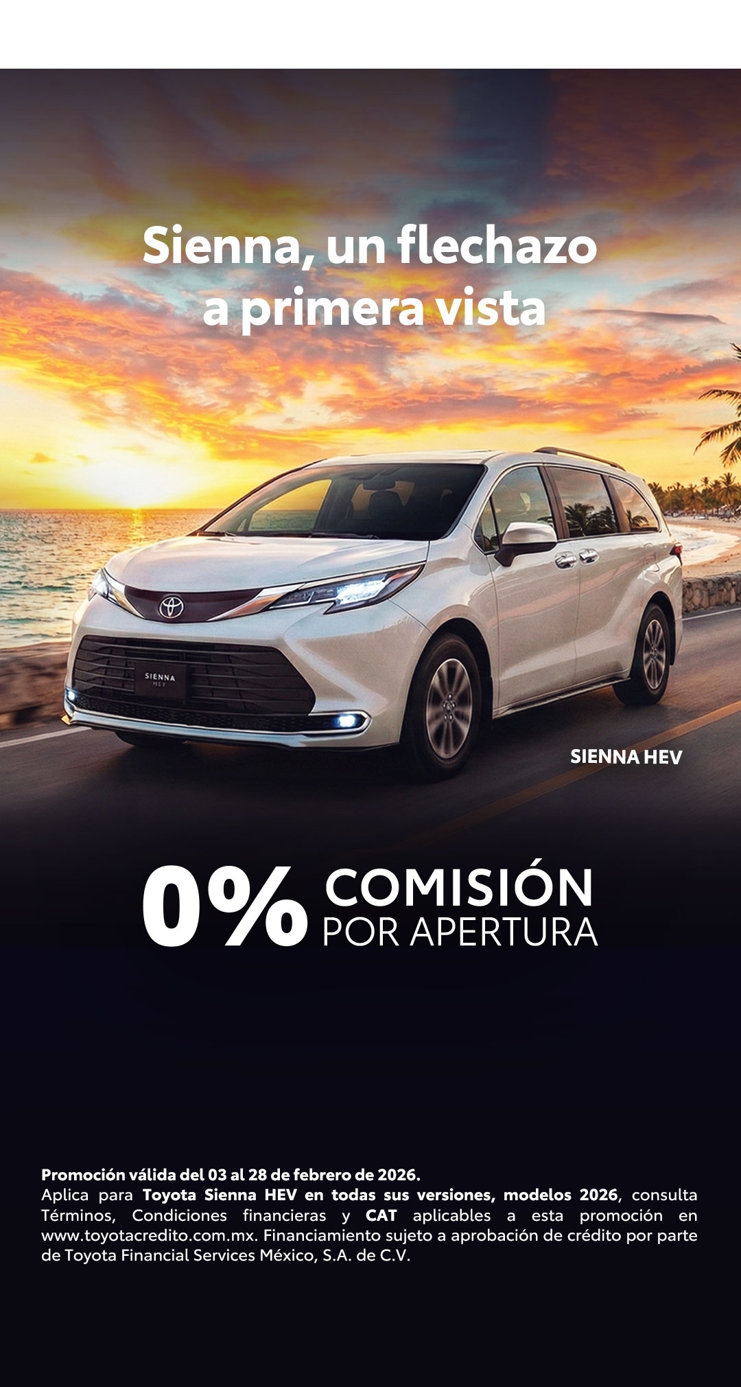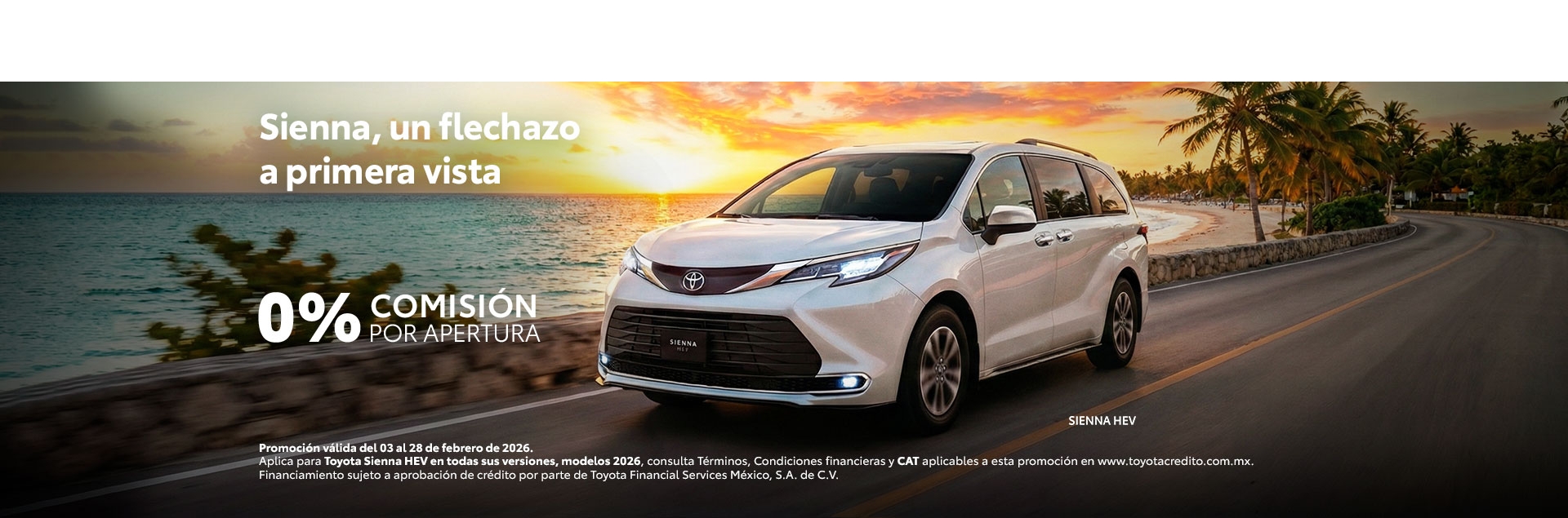 Aplica para Toyota Sienna HEV en todas sus versiones, modelos 2026; bajo las siguientes condiciones de contratación: tasa de interés desde 11.99%; comisión por apertura del 0%; plazos de financiamiento desde 12 y hasta 72 meses; con un enganche desde 10% tomando en cuenta el valor del vehículo en la fecha de publicación de este aviso; esta promoción aplica para todos los esquemas de financiamiento. Asimismo, el producto financiero a que se refiere este aviso requiere la contratación obligatoria de dos seguros, el primero contra daños y otro, una póliza de SEGURO DE VIDA CRÉDITO CON PERIODO DE CARENCIA Y MUERTE ACCIDENTAL, las pólizas pueden ser pagadas ya sea en un esquema financiado o cubierto en una sola exhibición al momento de la firma del contrato. Cualquier modificación a los elementos antes referidos, cambiará invariablemente las condiciones del financiamiento, por tal razón le sugerimos consultar términos y condiciones con el Distribuidor Toyota de su preferencia;
