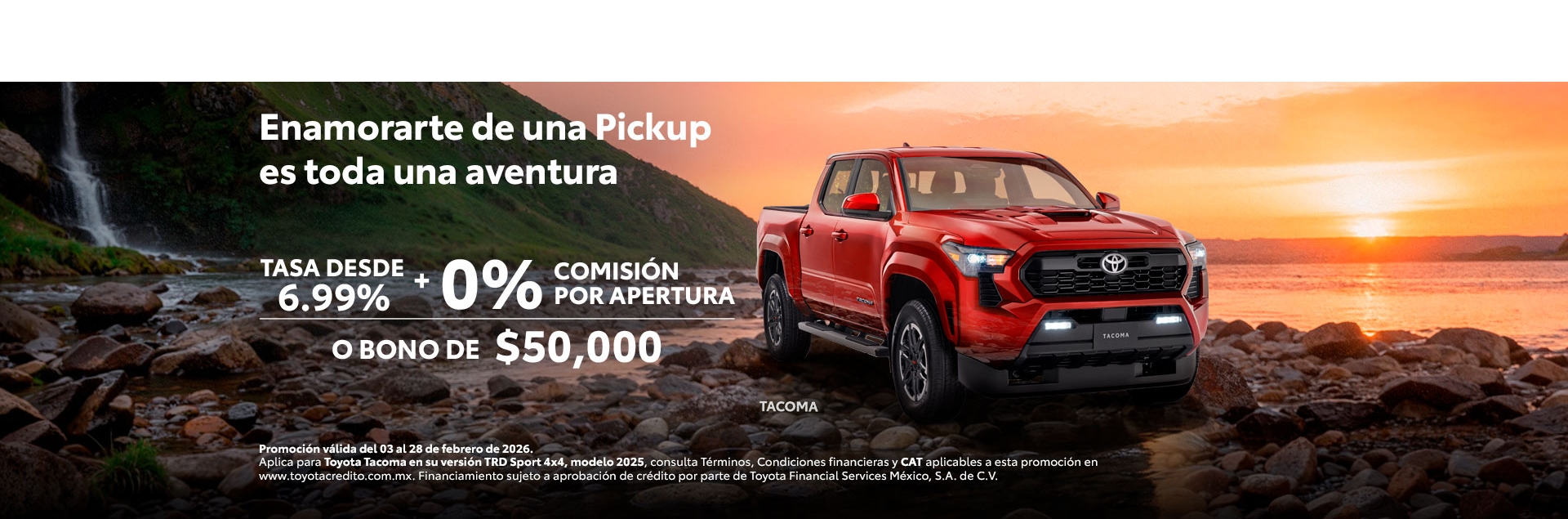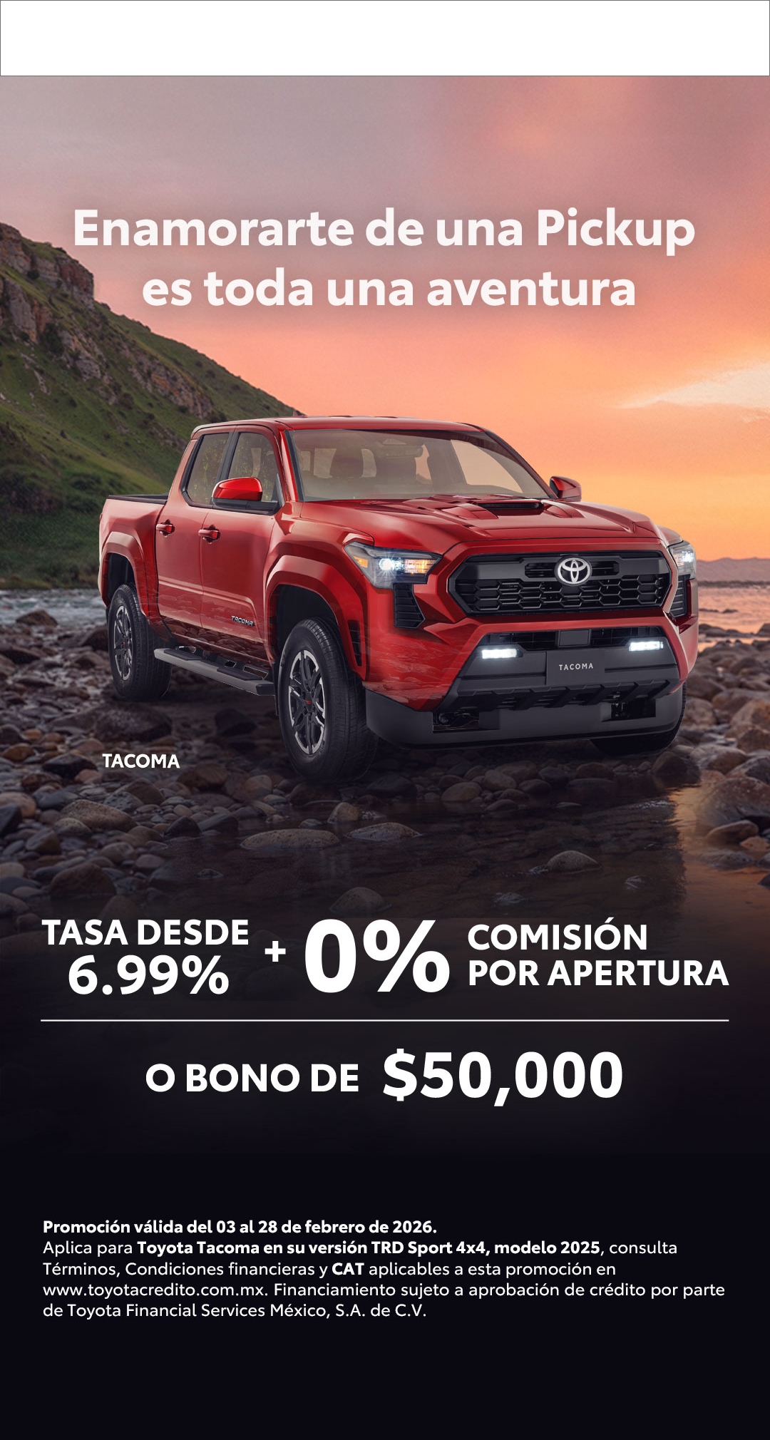 Aplica para Toyota Tacoma en su versión TRD Sport 4x4, modelo 2025; bajo las siguientes condiciones de contratación: tasa de interés desde 10.99%; comisión por apertura del 0%; plazos de financiamiento desde 12 y hasta 72 meses; con un enganche desde 10% tomando en cuenta el valor del vehículo en la fecha de publicación de este aviso; esta promoción aplica para todos los esquemas de financiamiento. Este plan incluye un BONO por la cantidad de $50,000 Moneda Nacional (cincuenta mil pesos 00/100 M.N.) el cual se aplicará EXCLUSIVAMENTE al costo de adquisición del vehículo. Asimismo, el producto financiero a que se refiere este aviso requiere la contratación obligatoria de dos seguros, uno contra daños y el otro, una póliza de SEGURO DE VIDA CRÉDITO CON PERIODO DE CARENCIA Y MUERTE ACCIDENTAL, las pólizas pueden ser pagadas ya sea en un esquema financiado o cubierto en una sola exhibición al momento de la firma del contrato. Cualquier modificación a los elementos antes referidos, cambiará invariablemente las condiciones del financiamiento, por tal razón le sugerimos consultar términos y condiciones con el Distribuidor Toyota de su preferencia;