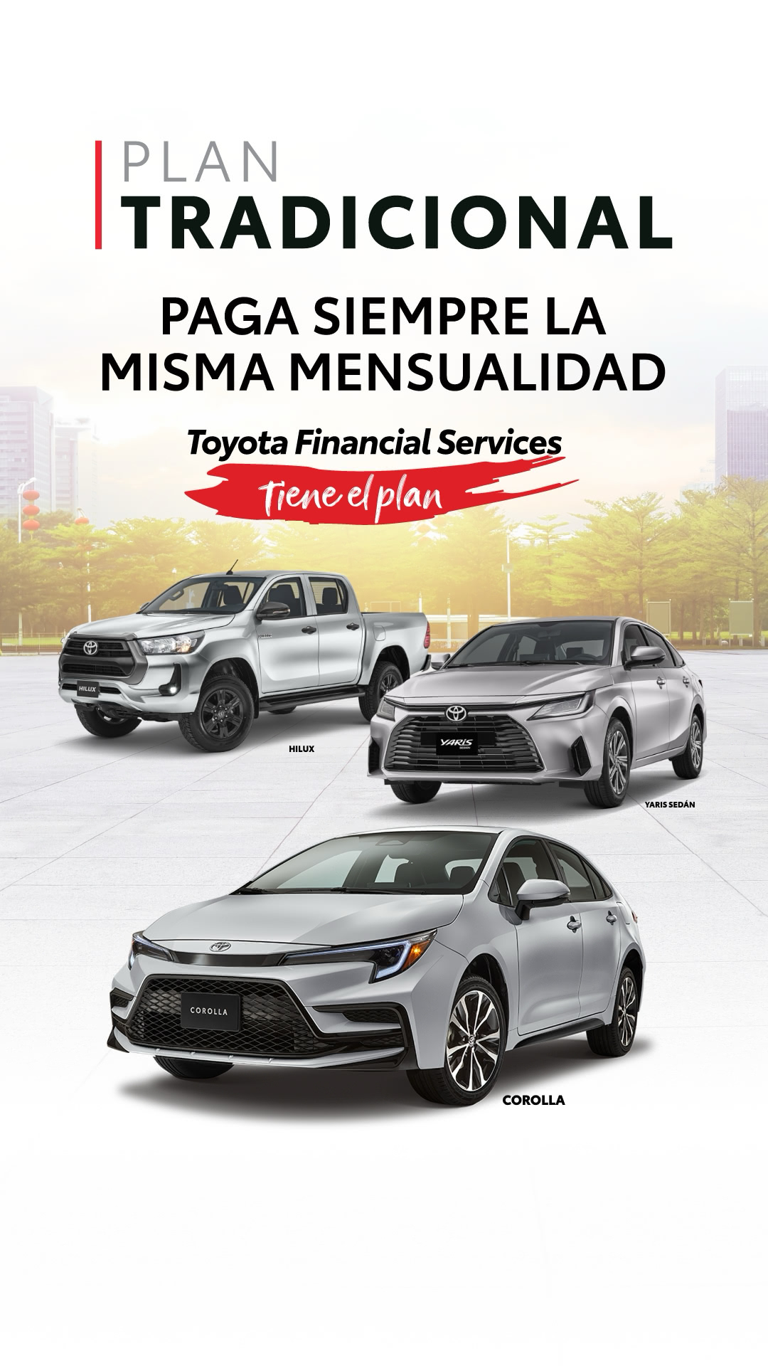 En caso de requerir más información acerca del Plan Tradicional, favor de acudir a tu Distribuidor autorizado Toyota más cercano. La imagen del vehículo es únicamente ilustrativa y puede variar de las versiones físicas.
