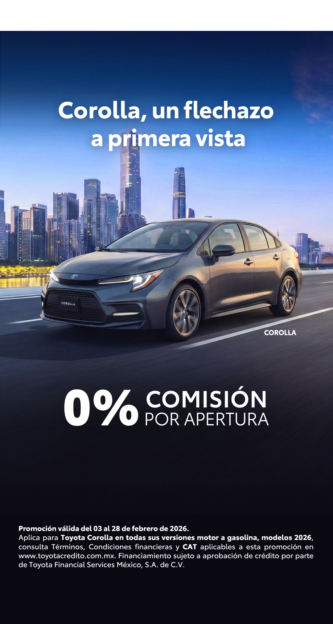 Aplica para Toyota Corolla en todas sus versiones motor a gasolina, modelos 2026; bajo las siguientes condiciones de contratación: tasa de interés desde 11.99%; comisión por apertura del 0%; plazos de financiamiento desde 12 y hasta 72 meses; con un enganche desde 10% tomando en cuenta el valor del vehículo en la fecha de publicación de este aviso; esta promoción aplica para todos los esquemas de financiamiento. Asimismo, el producto financiero a que se refiere este aviso requiere la contratación obligatoria de dos seguros, el primero contra daños y otro, una póliza de SEGURO DE VIDA CRÉDITO CON PERIODO DE CARENCIA Y MUERTE ACCIDENTAL, las pólizas pueden ser pagadas ya sea en un esquema financiado o cubierto en una sola exhibición al momento de la firma del contrato. Cualquier modificación a los elementos antes referidos, cambiará invariablemente las condiciones del financiamiento, por tal razón le sugerimos consultar términos y condiciones con el Distribuidor Toyota de su preferencia;