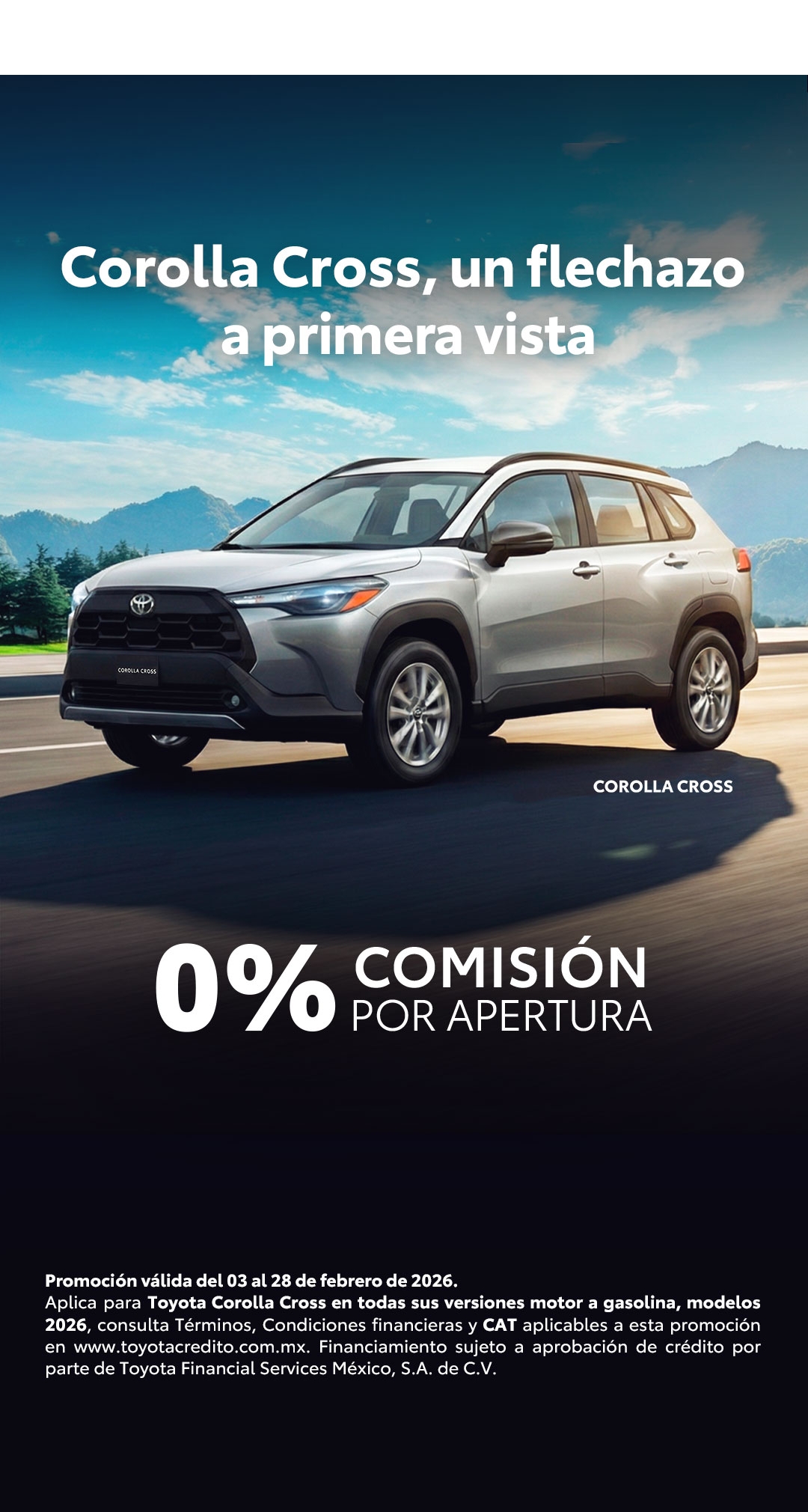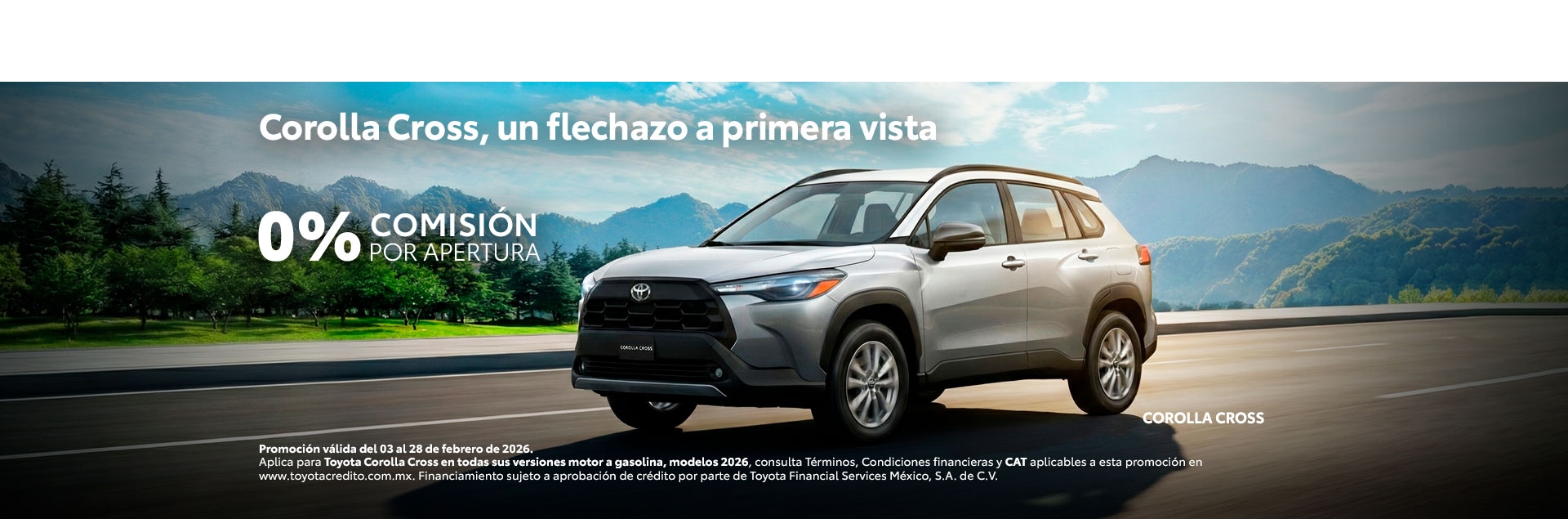 Aplica para Toyota Corolla Cross en todas sus versiones motor a gasolina, modelos 2026; bajo las siguientes condiciones de contratación: tasa de interés desde 11.99%; comisión por apertura del 0%; plazos de financiamiento desde 12 y hasta 72 meses; con un enganche desde 10% tomando en cuenta el valor del vehículo en la fecha de publicación de este aviso; esta promoción aplica para todos los esquemas de financiamiento. Asimismo, el producto financiero a que se refiere este aviso requiere la contratación obligatoria de dos seguros, el primero contra daños y otro, una póliza de SEGURO DE VIDA CRÉDITO CON PERIODO DE CARENCIA Y MUERTE ACCIDENTAL, las pólizas pueden ser pagadas ya sea en un esquema financiado o cubierto en una sola exhibición al momento de la firma del contrato. Cualquier modificación a los elementos antes referidos, cambiará invariablemente las condiciones del financiamiento, por tal razón le sugerimos consultar términos y condiciones con el Distribuidor Toyota de su preferencia;