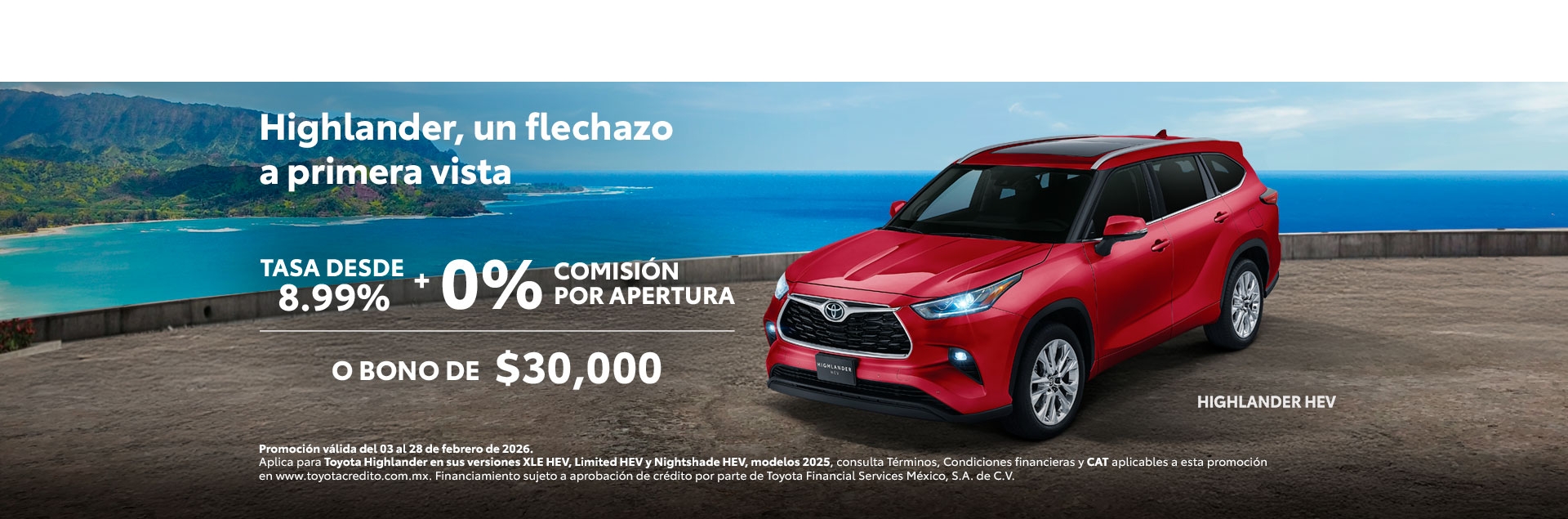 Aplica para Toyota Highlander en sus versiones XLE HEV, Limited HEV y Nightshade HEV, modelos 2025; bajo las siguientes condiciones de contratación: tasa de interés desde 10.99%; comisión por apertura del 0%; plazos de financiamiento desde 12 y hasta 72 meses; con un enganche desde 10% tomando en cuenta el valor del vehículo en la fecha de publicación de este aviso; esta promoción aplica para todos los esquemas de financiamiento. Este plan incluye un BONO por la cantidad de $30,000 M.N.  (treinta mil pesos 00/100 M.N.) el cual se aplicará EXCLUSIVAMENTE al costo de adquisición del vehículo. Asimismo, el producto financiero a que se refiere este aviso requiere la contratación obligatoria de dos seguros, el primero contra daños y otro, una póliza de SEGURO DE VIDA CRÉDITO CON PERIODO DE CARENCIA Y MUERTE ACCIDENTAL, las pólizas pueden ser pagadas ya sea en un esquema financiado o cubierto en una sola exhibición al momento de la firma del contrato. Cualquier modificación a los elementos antes referidos, cambiará invariablemente las condiciones del financiamiento, por tal razón le sugerimos consultar términos y condiciones con el Distribuidor Toyota de su preferencia;
